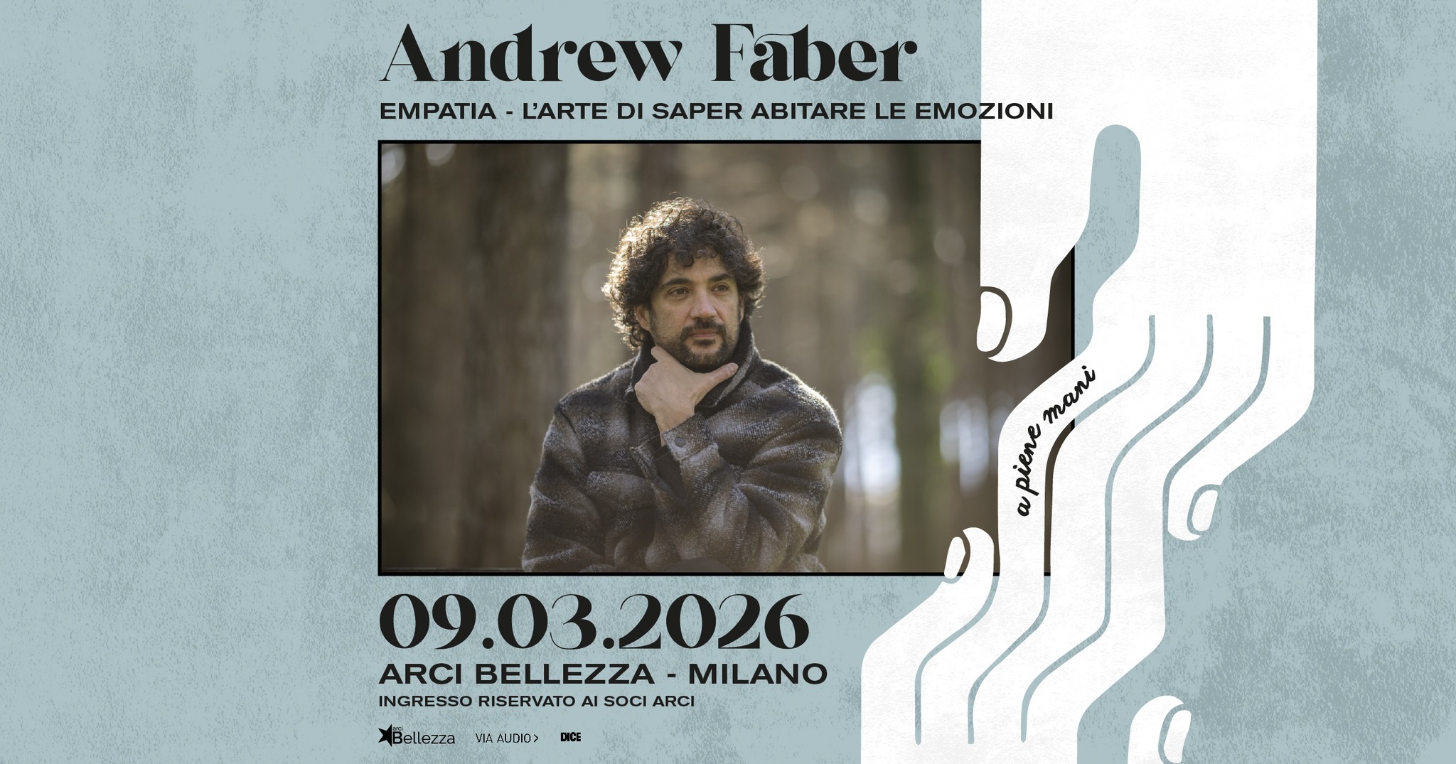 Con queste parole si apre: "Empatia - Lβarte di saper abitare le emozioni", uno spettacolo che intreccia poesia, racconti, monologhi e musica dal vivo. Andrew Faber abbraccia il pubblico in uno spazio intimo e condiviso, in cui ci si riconosce, si ride, ci si emoziona e, a volte, si resta in silenzio. Ad accompagnarlo al pianoforte, il Maestro Carlo Valente, cantautore e polistrumentista, vincitore del Premio "Voci per la LibertΓ " e "Una canzone per Amnesty". Le sue musiche dialogano con la voce di Faber, amplificandone le emozioni e accompagnando il pubblico in unβesperienza poetica intensa e partecipata.