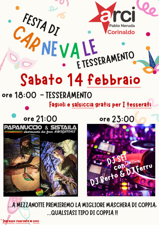FESTA DI CARNEVALE E TESSERAMENTO ALL'ARCI PABLO NERUDA