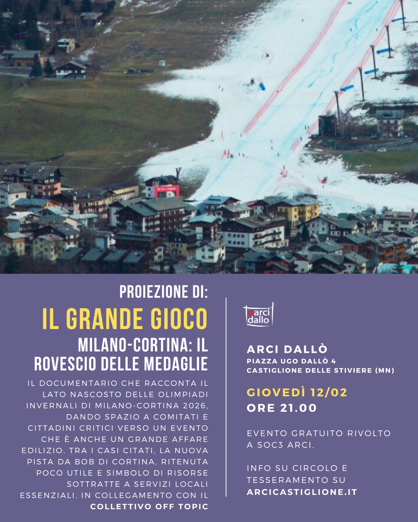 Giovedì 12 febbraio, ore 21.00, al Circolo Arci Dallò proiettiamo Il Grande Gioco, il documentario che racconta il lato nascosto delle Olimpiadi Invernali Milano-Cortina 2026.