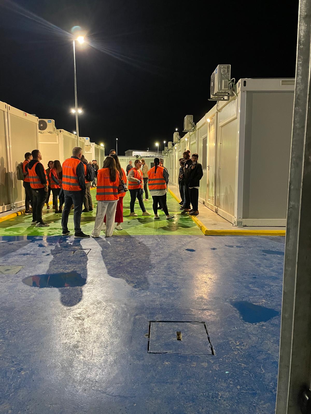 E in effetti, varcato il cancello è davvero in un cantiere che si entra. Entriamo grazie alla presenza di Francesca Ghirra, deputata di Avs e di Rachele Scarpa, deputata Pd. Con loro, una delegazione del Tavolo Asilo e Immigrazione formata da due mediatori culturali. L’80% delle strutture previste sono da finire o non sono ancora nemmeno costruite. Le ruspe scavano, le betoniere scaricano cemento, i pali del recinto del centro dove il governo ha rinchiuso i migranti sono solo infilati in buchi nel cemento e tenuto dritto da dei cunei di legno.