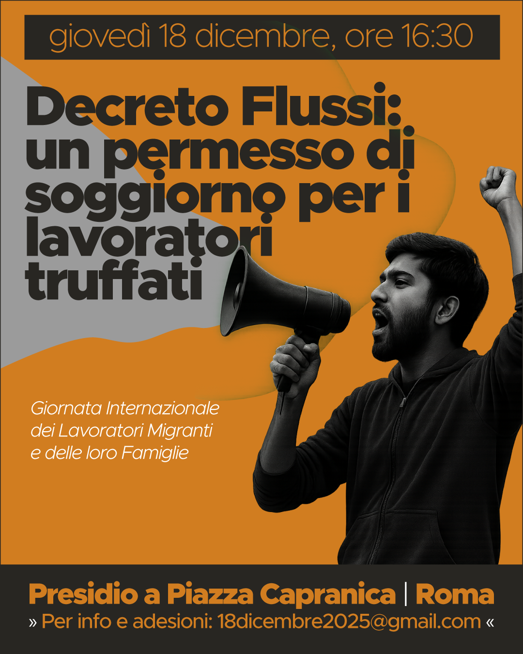 Il 18 dicembre 2025, in occasione della Giornata Internazionale dei Lavoratori Migranti e delle loro Famiglie, numerose organizzazioni sociali e sindacali scendono in piazza a Roma, in piazza Capranica dalle 16:30, insieme a lavoratori e lavoratrici vittime di un sistema ingiusto. Assemblee, iniziative e mobilitazioni si terranno anche in altre città italiane, per chiedere una riforma radicale del Decreto Flussi e politiche migratorie più giuste e trasparenti.