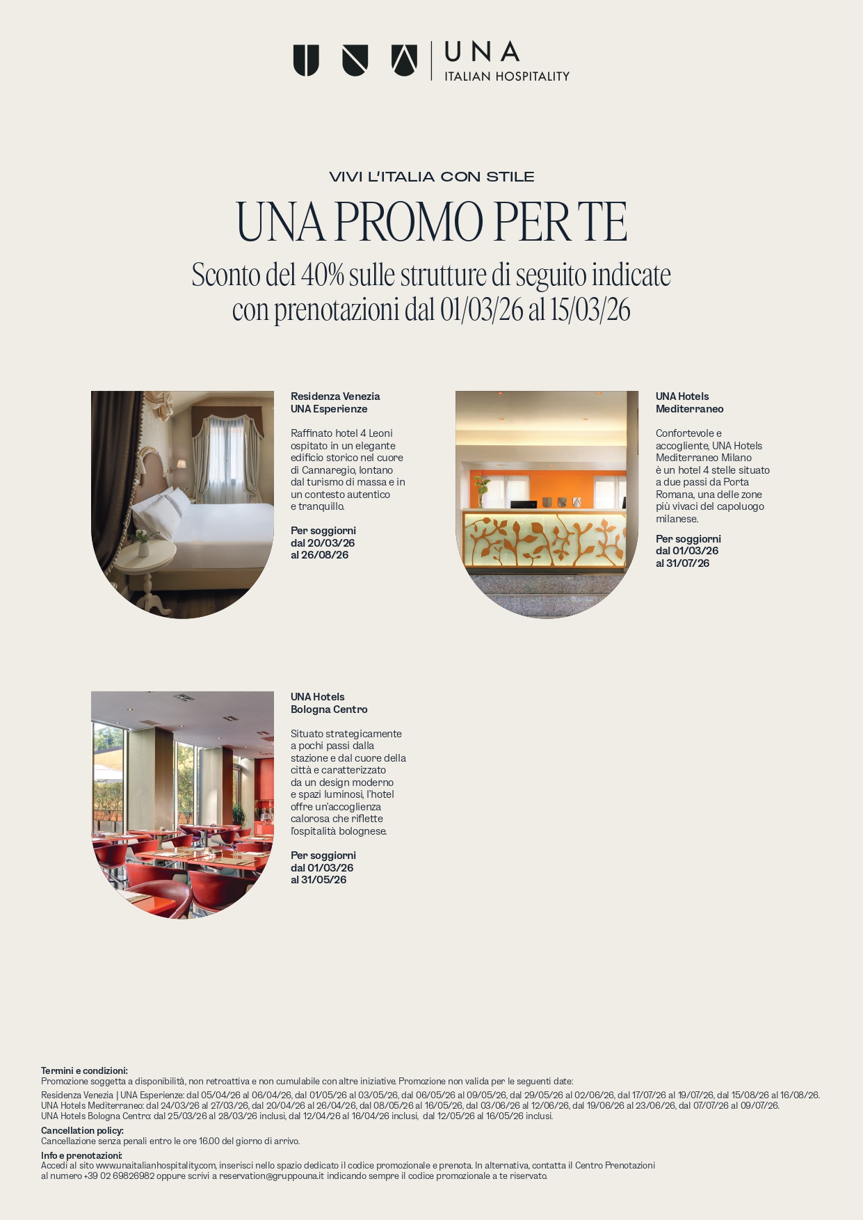 In alternativa, contatta il Centro Prenotazioni Gruppo UNA al numero +39 02 69826982 oppure scrivi a reservation@gruppouna.it indicando sempre il codice promozionale a Voi riservato.